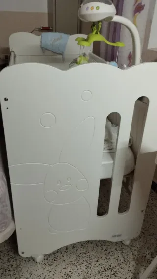 Cuna de bebé en color blanco con un tierno diseño. - Estructura de madera. - Diseño de conejito y círculos. - Ruedas para facilitar el movimiento.