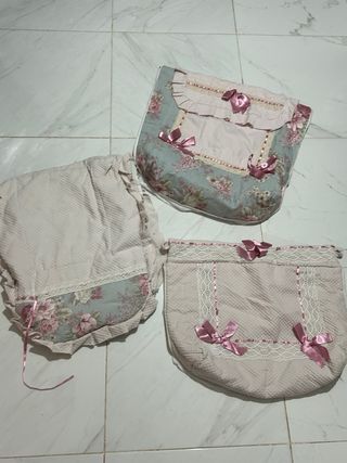Bolso de tela con un bonito estampado floral en tonos marrones y beige. Tiene asas de tela y un cierre de lazada. Esta con la eriqueta. Incluye capota blanca y para el carrito de primera bebe - Estampado floral. - Asas de tela. - Cierre de lazada.