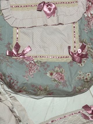 Conjunto de colchoneta para capazo y muselina a juego. - Diseño blanco con pequeños detalles florales en rosa. - Colchoneta con volantes. - Tejido de muselina suave.