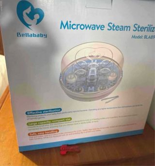 Esterilizador de vapor para microondas Bellababy. - Esterilización eficaz contra bacterias dañinas. - Gran capacidad para 4 biberones y 4 accesorios. - Diseño compacto, ideal para viajes. - Manejo seguro y sencillo.