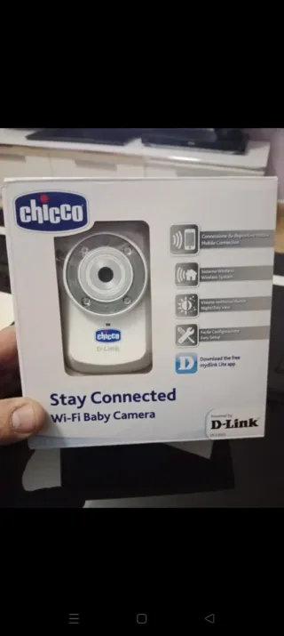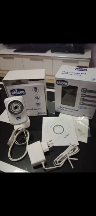 Cámara de vigilancia para bebés Chicco, modelo Stay Connected.se a sacado de la caja para echarle la foto - Conexión a dispositivo móvil. - Sistema inalámbrico. - Visión nocturna/diurna. - Fácil configuración. - Descarga la app mydlink Lite.