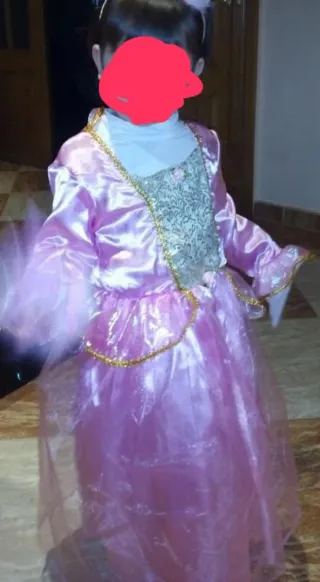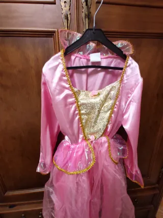 Precioso disfraz de princesa para niña en color rosa. - Tejido satinado brillante. - Detalles dorados. - Mangas abullonadas. - Falda con varias capas. Talla 4_6 años