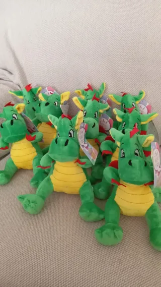 Lote de peluches de dragón, perfectos para coleccionar o regalar. - Diseño de dragón verde con detalles amarillos. - Adornados con pequeños detalles rojos en las orejas y cola. - Incluyen etiquetas de Chi Que Es.