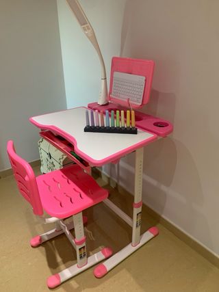 Conjunto de escritorio y silla diseñado para niños, en un llamativo color rosa. - Escritorio con superficie blanca y detalles rosas. - Silla a juego con respaldo. - Lámpara de escritorio integrada. - Soporte para tablet o libro. - Cajón organizador. - Altura ajustable.