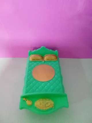 Conjunto de muebles de juguete temáticos de Frozen. - Armario azul con detalles dorados. - Cama verde con dosel y detalles dorados. - Tocador azul con espejo. - Maniquí azul.