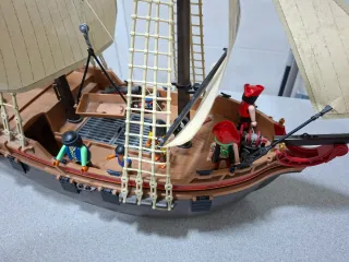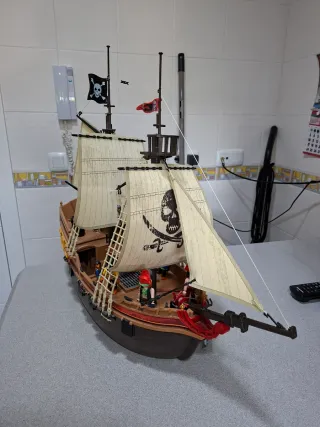Barco pirata de Playmobil con figuras. - Barco de juguete con velas. - Incluye varias figuras de piratas. - Detalle de cañón y red.