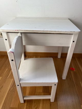 Conjunto de pupitre Sundvik Ikea y silla infantil evolutiva de Sobuy. - Estructura de madera. - Asiento y respaldo blancos. - medidas en fotografia - Señales de uso pero en perfecto estado
