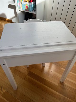 Pupitre infantil original de El Corte Inglés con tapa abatible y espacio de almacenaje interior, incluye taburete a juego. Fabricado en madera, acabado en blanco y natural, muy estable y resistente. Ideal para dibujar, leer o hacer deberes. En buen estado general, con señales normales de uso. Se vende el conjunto completo.