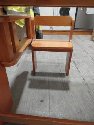Pupitre infantil de madera, perfecto para que los más pequeños realicen sus tareas o jueguen. - Estructura de madera. - Incluye un pequeño elevador para la mesa. - Tiene un cajón interior (al levantar la tabla que hace de mesa) - Silla de madera a juego (el cojín puede cambiarse) - Mide 60cm de largo y 57cm de ancho.
