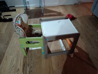 Se vende trona para bebé convertible en silla + pupitre marca innovaciones MS. Respaldo reclinable. Reposapiés. Fácil desenfundado para lavarla. Doble bandeja extraíble. Se puede colocar también junto a la mesa, adaptándose a las necesidades del niño/a. Cómo nueva, solo usada por un niño. Se convierte en pupitre cuando ya no se necesita la trona. Mejor ver.