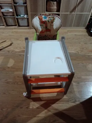 Trona muy buena, totalmente funcional. Tiene dos bandejas según las necesidades por la edad. El respaldo tiene varias posiciones de inclinación, y tiene un bolsillo para el babero. Colores alegres y muy resistente, súper fácil de limpiar. Lo mejor de todo, que simplemente apretando un botón se convierte en silla y mesa de dibujo, un pupitre con su zona para dejar las pinturas y una tapa para colocar el papel en vertical. Falta un tornillo, pero no es relevante para la seguridad ni estabilidad de la trona, no es peligroso. También le faltan las cinchas-cinturón originales, pero lo doy con lo que adapte yo (ni se caen ni se lo pueden quitar).