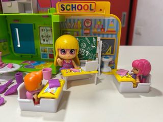 Set de juego de la Escuela Pinipon. Incluye figuras y accesorios. No creo que esté todo, es para completar otro juego o para duplicar personajes. - Dos figuras de muñecas. - Accesorios variados como pupitres, taquillas y un micrófono.