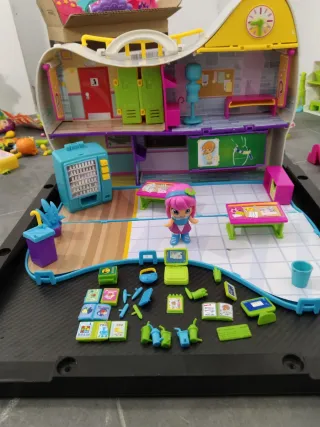 Instituto de PinyPon con diseño moderno y colorido. - Muchos complementos , pupitres, fuente, mesas, máquinas expendedora de refrescos, taquillas .... -Muleca Pinypon - Estructura de plástico azul. - Ventanas con siluetas de personajes. - Asa para transporte.