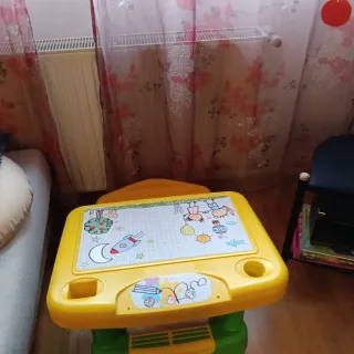 Escritorio infantil de la marca Chicos. Buen estado. Con cajón guarda objetos al levantar la mesa. El papel del frontal está algo pintado pero se podría sustituir por uno nuevo.