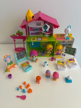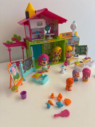 Set de juego de colegio de Pinypon. Incluye figuras y accesorios para recrear escenas escolares. Incluye 6 figuras (profesora y 5 alumnos). Originalmente traía solo 3 figuras. Aulas con pizarra, mesa de la profe, pupitre, estantería con materiales de música y arte, un esqueleto, zona de recreo con fuente, cancha de baloncesto, columpio...