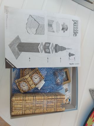 Montaje de puzzle 3D Big Ben, prácticamente nuevo. Ideal para amantes de los rompecabezas y la arquitectura. - Fabricado con piezas de cartón resistentes. - Diseño detallado y preciso. - Incluye base para la exposición.