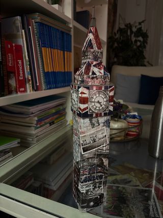 Preciosa maqueta del Big Ben en forma de puzzle. Ideal para decorar o coleccionar. - Es un puzzle 3D con imágenes de Londres. - Está en perfecto estado, sin piezas dañadas. - Mide aproximadamente 25 cm de alto. - 216 piezas de puzzle 2 piezas cuadradas para sostener y 1 pico