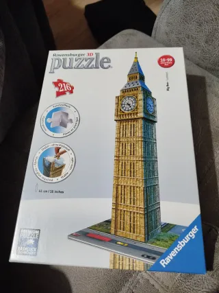 Puzzle 3D de Ravensburger que representa el Big Ben de Londres. Ideal para coleccionistas y aficionados a los puzzles. precintado sin abrir costo 28€ en corte inglés - 216 piezas - Tecnología Easyclick para un encaje perfecto. - Montaje estable sin necesidad de pegamento. - Dimensiones: 41 cm / 16 pulgadas