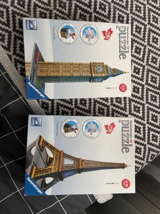 Dos puzzles 3D de la marca Ravensburger para construir modelos icónicos. - Puzzle 3D Big Ben - Londres (216 piezas). - Puzzle 3D La Tour Eiffel - París (216 piezas). - Tecnología Easyclick para un montaje sin pegamento. 12€ cada uno