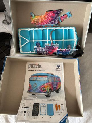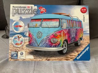 Puzzle 3D de la icónica furgoneta Volkswagen T1 Camper de Ravensburger. Ideal para coleccionistas y amantes de los puzzles. Algunas peizas están un poco dobladas, no afecta su consytrucción final. - 162 piezas. - Tecnología Easyclick, no necesita pegamento. - Dimensiones aproximadas: 30 x 14 x 15 cm. - Edad recomendada: 10-99 años.