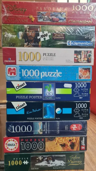 Lote de 8 puzzles de 1000 piezas. - Puzzle Disney Cars Panorama 1000 piezas Clementoni. - Puzzle Disney Pirates of the Caribbean 1000 piezas Clementoni. - Puzzle Jumbo Máscaras 1000 piezas. - Puzzle Diset Fresh Water 1000 piezas. - Puzzle Diset Hoja Verde 1000 piezas. - Puzzle Au pays des pyramides 3D 1000 piezas Nathan. - Puzzle Educa Calle Broadway 1000 piezas. - Puzzle Perro y Gato tumbados 1000 piezas. - Decoración Pasta Educa Precio cada uno. Entrego en mano zona metro de Goya o ENVÍO POR CORREOS CERTIFICADO . Dispongo de más modelos en mi perfil