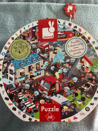 Puzzle circular de la marca Janod con temática de bomberos y rescate. Incluye una pieza de puzzle adicional con el logo de la marca. - 208 piezas. - Ilustración detallada de una ciudad en acción. - Diseño circular. - Incluye pieza de puzzle extra.