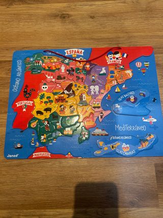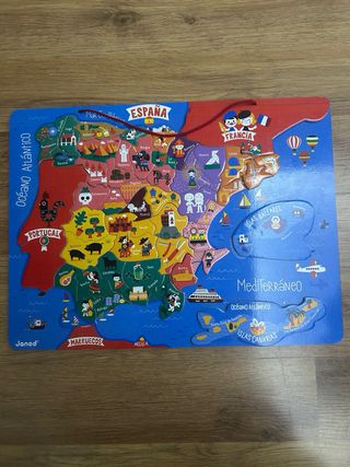 Divertido puzzle de madera de la península ibérica y Portugal, ideal para aprender geografía. - Incluye piezas de las diferentes comunidades autónomas y países vecinos. - Ilustraciones coloridas con monumentos y animales. - Marca: Janod.