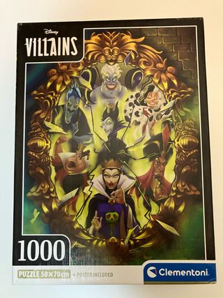 Puzzle de 1000 piezas con los villanos más icónicos de Disney. Incluye póster. - Personajes: Reina Malvada, Cruella de Vil, Úrsula, Hades, Jafar y más. - Tamaño del puzzle: 50x70 cm. - Marca: Clementoni.