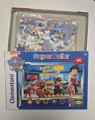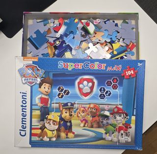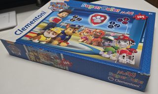 Puzzle de la Patrulla Canina con 104 piezas. Ideal para los más pequeños, con personajes de la Patrulla Canina. Caja un poco marcada en una esquina.
