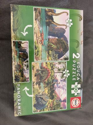 Puzzle de la marca Educa con temática de dinosaurios. Incluye dos puzzles de 100 piezas cada uno. - Ilustraciones detalladas de dinosaurios y paisajes prehistóricos. - Formato panorámico en uno de los puzzles. - Ideal para aficionados a los puzzles y a los dinosaurios.