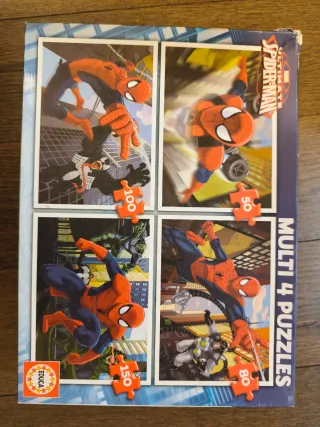 Set de 4 puzzles de Spiderman de la marca Educa. - Puzzles de 100, 50, 150 y 80 piezas. - Imágenes de Spiderman en acción. - Ideal para fans del superhéroe.