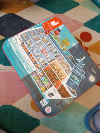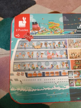 Set de dos puzzles de la marca Janod, uno de 100 piezas y otro de 200 piezas. El diseño muestra un crucero con diferentes escenas interiores y exteriores. - Puzzle 1: 100 piezas. - Puzzle 2: 200 piezas. - Diseño: Crucero. - Marca: Janod. - Fabricado en Francia.