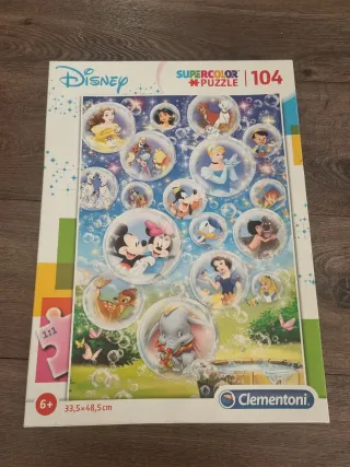 Puzzle de la marca Clementoni con licencia Disney. - 104 piezas. - Diseño Supercolor. - Personajes de Disney como Mickey, Minnie, Bambi, Dumbo, Cenicienta, Bella, Jazmín, Blancanieves, Alicia, y más. - Medidas: 33,5 x 48,5 cm.