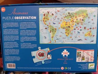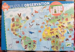 Puzzle educativo de la marca Djeco, ideal para aprender sobre animales y geografía. - 100 piezas. - Ilustraciones de animales del mundo. - Incluye un libreto con información adicional.