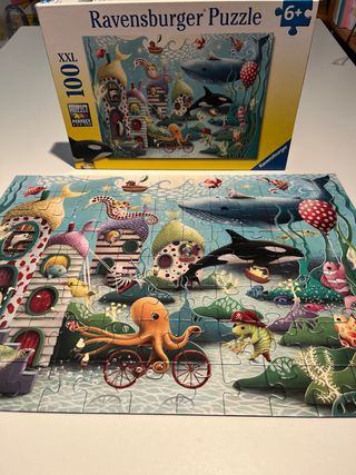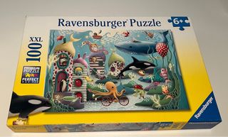 Puzzle Ravensburger de 100 piezas con temática del fondo marino. Es un modelo XXL. - Ilustración submarina con animales marinos y casas. - Marca: Ravensburger. - Número de piezas: 100.