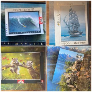 Se venden varios puzzles de diferentes marcas y temáticas. Todos juntos 20€, por separado 6€ cada uno. Tengo más en mi perfil preguntar para cualquier cosa. - Puzzle Surf Mavericks de 1000 piezas. - Puzzle Velero de Clementoni de 500 piezas. - Puzzle Gatitos de Educa de 500 piezas. - Puzzle paisaje de Wild Horse de 1000 piezas.