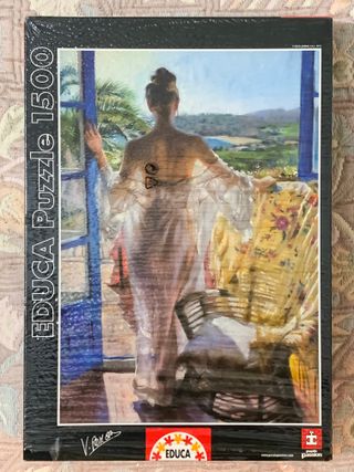 Puzzle de la marca Educa de 1500 piezas sin abrir. Trata de una mujer, de espaldas, posando de espaldas, con las ventanas de la terraza abierta con vistas a un lago y las montañas.