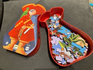 Puzzle de la marca Djeco con la temática El Pirata y su Tesoro. - Diseño de pirata con loro y tesoros. - Incluye 36 piezas. - Recomendado para mayores de 4 años.