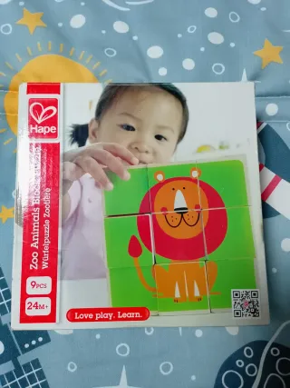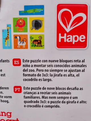 Puzzle de animales de la marca Hape, ideal para los más pequeños. Fomenta el aprendizaje a través del juego. Incluye 9 piezas. Las piezas son grandes, no entran en la boca. Recomendado a partir de 24 meses. Se forman seis animales: mono, elefante, cebra, león, jirafa y cocodrilo. Se montan siguiendo el formato 3x3 execpto la jirafa y el cocodrilo lo que estimula la inteligencia y la resolución de problemas. Además con este puzzle se trabaja la motricidad fina, la atención y la concentración.