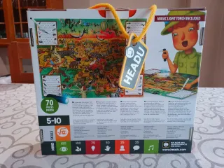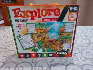 Puzzle educativo de la marca Headu, modelo Explore The Safari con Magic Light de 70 piezas. Ideal para aprender observando y descubriendo. Incluye linterna de luz mágica y rotulador. Alumbrando con la linterna se ven imágenes ocultas en el puzzle. Temática de safari con animales. Diseñado para edades de 5 a 10 años. Está en perfecto estado, como nuevo, tanto el puzzle, como la caja y la linterna y el rotulador en su caja original.