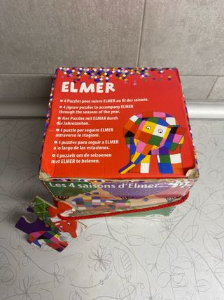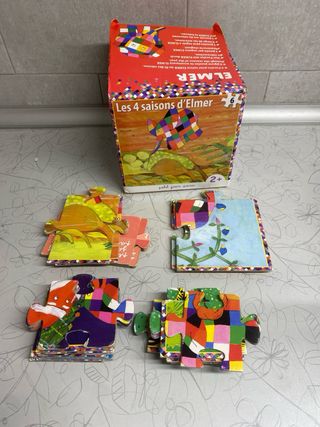 Set de 4 puzzles del elefante Elmer, cada uno representando una estación del año. Ideal para los más pequeños. PETITE jour París - Incluye 4 puzzles. - Temática: Las 4 estaciones. - Personaje: Elmer el elefante. Precioso Esta usado y con alguna marca de boli