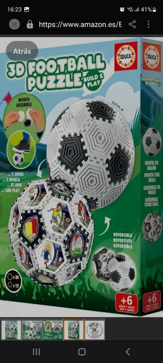 Puzzle 3D de un balón de fútbol de la marca Educa, ideal para construir y jugar. Diseñado para niños a partir de 6 años. - Incluye 20 piezas grandes y 12 piezas pequeñas. - El balón es reversible y muestra diferentes selecciones de fútbol. - Diámetro aproximado de 12,5 cm.
