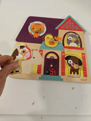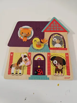 Puzzle encajable de madera de la marca Janod con sonidos de animales 🐶🐱🐦. Al colocar cada pieza en su lugar, se escucha el sonido correspondiente, haciendo el juego aún más divertido y educativo. Ideal para desarrollar la motricidad fina, la coordinación ojo-mano y la asociación sonido-animal. Colores alegres y piezas con pomo fáciles de agarrar. Muy bien estado, cuidado y completo, con caja original. Ideal para peques desde 18 meses. Wooden sound peg puzzle by Janod 🐶🐱🐦. When each piece is placed correctly, it plays the corresponding animal sound, making learning fun and engaging. Helps develop fine motor skills.
