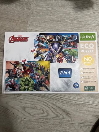 Puzzle de los Vengadores de Marvel, marca Trefl. Incluye dos diseños diferentes en un solo paquete. - 2 puzzles en 1. - Cada puzzle tiene 60 piezas. - Diseño ECO PUZZLE, sin plástico. - Materiales naturales.