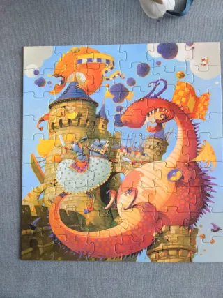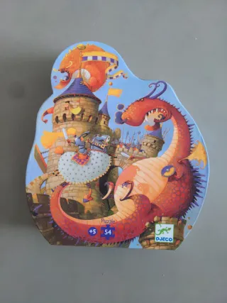 Divertido puzzle de la marca Djeco con una escena de dragón atacando un castillo. Ideal para niños a partir de 5 años. Como nuevo. Más puzzles, juegos y libros en mi perfil. Se hacen envíos por wallapop. - 54 piezas. - Ilustración colorida y detallada. - Diseño de la marca Djeco.