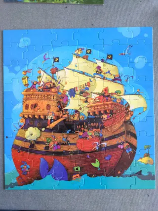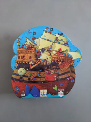 Divertido puzzle de la marca Djeco con temática pirata. Ideal para los más pequeños. Está en buen estado aunque ha sido montado varias veces. Más puzzles, juegos y libros en mi perfil. Se hacen envíos por wallapop. - Ilustración colorida de piratas en un barco. - 54 piezas. - Recomendado para mayores de 5 años.