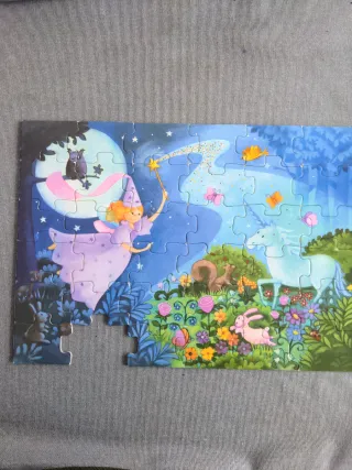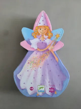 Precioso puzzle de la marca Djeco con forma de hada. Le falta 1 pieza (se ve en la segunda foto, parte inferior). Hay más puzzles, libros y juguetes en mi perfil. Se hacen envíos por wallapop. - Ilustración colorida y detallada. - 36 piezas. - Recomendado para mayores de 4 años.