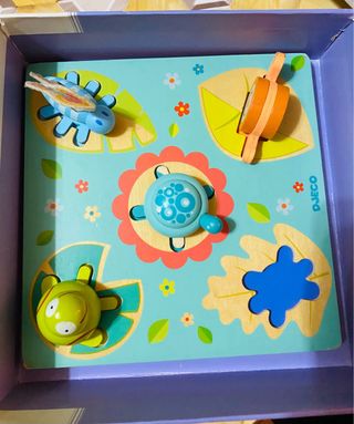 Divertido puzzle de encaje de madera de la marca Djeco. (La mariquita falta) - Incluye 5 piezas de animales. - Diseño colorido y educativo. - Fabricado en madera.