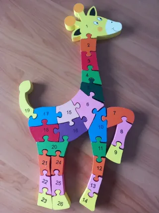 Puzzle de madera con forma de jirafa, ideal para aprender los números y las letras - Piezas de madera. - Diseño de jirafa. - Numerado del 1 al 26 y de la A a la Z ( sin la Ñ)