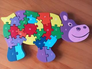 Divertido puzzle de madera con forma de hipopótamo. Las piezas están numeradas para facilitar el montaje. - Piezas de madera. - Diseño de hipopótamo. - Numerado del 1 al 26 y de la A a la Z( si la Ñ)